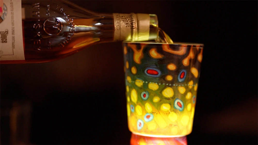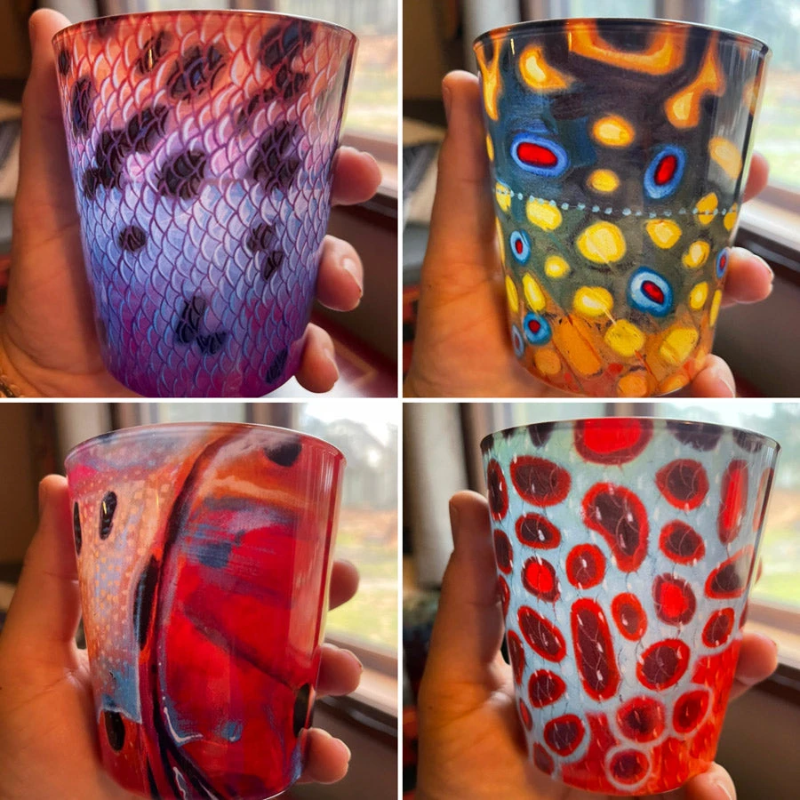 A rocks glass is a short tumbler used for serving a drink like whiskey (on the rocks) or cocktails like the Old Fashioned. These heavy duty rocks glasses showcase the best of DeYoung’s Abstract Fish Flank Series in a beautiful fully wrapped print around the glass. We have upgraded the glass and printing technique from the previous rocks glasses so the colors are even brighter and bolder than before. Available in Tarpon, Brook, Brown, Cutthroat or Rainbow. Buy as singles or as sets. Great compliment to the Pilsner Glasses. Microwave safe, but not dishwasher recommended. Printed in the USA.